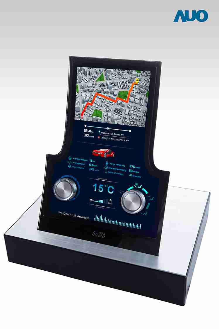 12.3 寸 Full HD LTPS 显示屏同样具备 1000 nits 高亮度,,搭载内嵌式触控技术,,整合驱动与触控 IC 于显示屏制程,,,使显示屏厚度降低,,为中控台创造更多机构设计空间。。应用于抬头显示器的 3寸 LTPS 显示屏具有高穿透率、、、1200:1 高对比度度,,,以及 297 PPI 高画素密度。。液晶最高可耐受到 110C 的高温 (TNI) 而不液化,,,,在阳光高温下维持优异稳定的显示效果。。